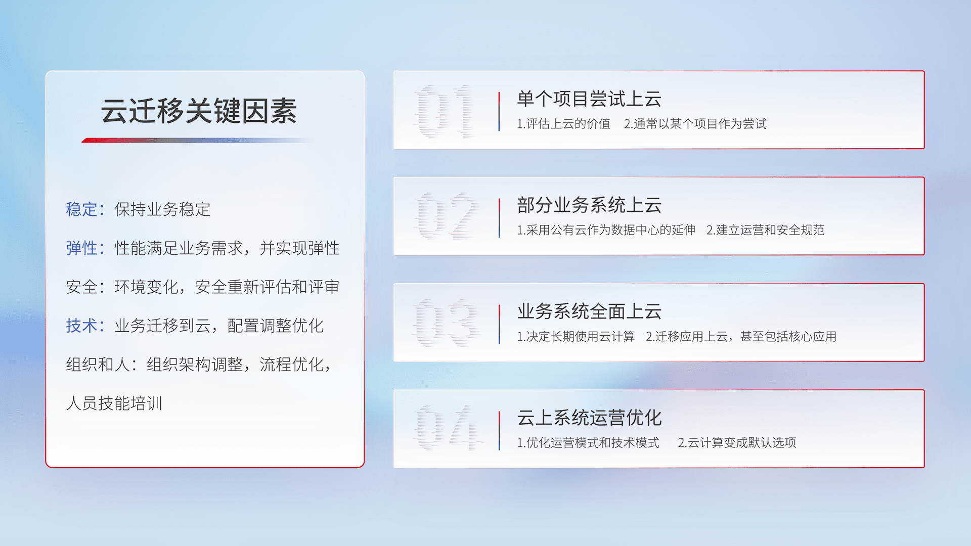 结合实际业务,,从规划设计、、云平台选型、、云原生改造、、数据迁移、、、集成交付,,,迁移全过程为客户识别最佳上云路径,,,做好风险识别管理,,设计网络架构、、身份权限、、、、安全审计合规、、、、操作审计、、日志审计、、监控告警策略、、、、多站点容灾设计等,,,对云上基础设施进行整体规划,,,提升IT治理水平,,,,以满足弹性、、、、高可用、、、高性能的需求。。
